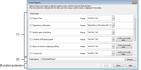 This dialog box is used to collectively output quality-related information such as a list of source files, build option settings, information on functions and variables, and coverage rates.