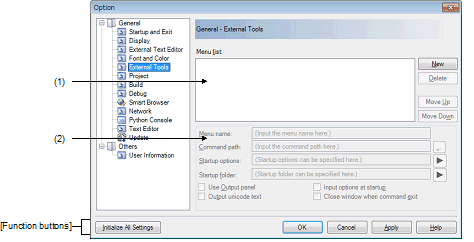 This area displays a list of menu items (added to the [Tool] menu) for launching external tools that have been added via this dialog box.