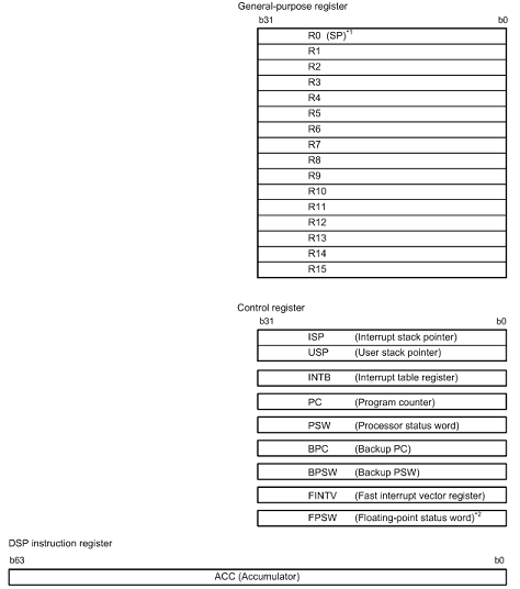 R0, a general-purpose register, also functions as the stack pointer (SP). The stack pointer is switched to operate as the interrupt stack pointer (ISP) or user stack pointer (USP) by the value of the stack pointer select bit (U) in the processor status word (PSW).
