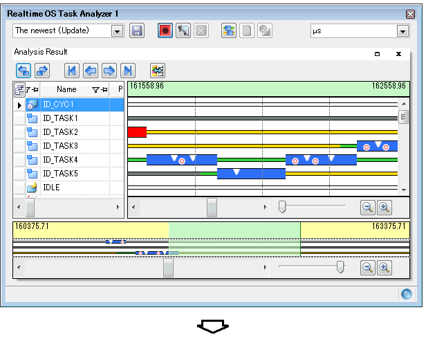 By pressing the button located on the Toolbar on the Realtime OS Task Analyzer panel, the user can clear the analysis information that is displayed in the Child-panel display area.
