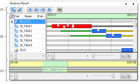 This panel is a Child-panel display area of the Realtime OS Task Analyzer panel to display the analysis information such as execution transition state of the processing program, the state of real-time OS resource usage, and the CPU usage status.