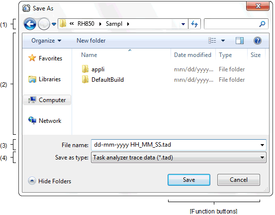 Saves the task analyzer trace data in the file specified in [File name] and [Save as type] in the folder specified in Folder location.