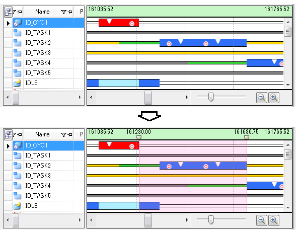 On the Analysis Result panel, by dragging and dropping with the mouse cursor in the Execution transition display area in the Analysis information diagram area, the user can change the analysis information to be displayed in the Analysis information table area from "analysis information in the trace data acquisition period" to "analysis information in the analysis information extraction interval".