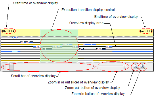 Displays the overview as an execution transition state of the processing program and real-time OS resource usage status for the displaying trace data specified by Zoom in or out slider of overview display or Zoom in button of overview display and Zoom in button of overview display.