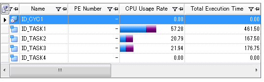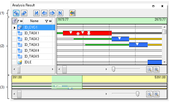This panel is a Child-panel display area of the Realtime OS Task Analyzer panel to display the analysis information such as execution transition state of the processing program, the state of real-time OS resource usage, and the CPU usage status.