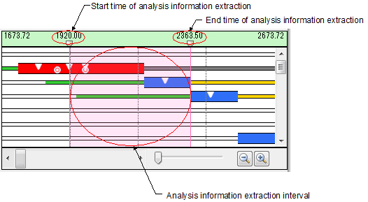 By dragging and dropping the mouse cursor in this area, the analysis information to be displayed in the Analysis information table area can be updated from "analysis information during the trace data acquisition period" to "analysis information during the analysis information extraction interval". |
