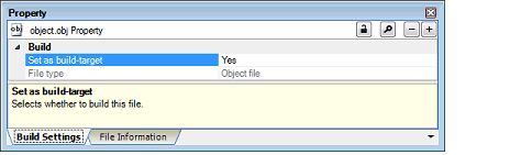 This tab shows the detailed information on each C source file, assembly source file, object file, and library file categorized by the following and the configuration can be changed.