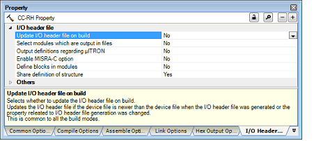 This tab shows the detailed information on the I/O header file generation tool categorized by the following and the configuration can be changed.