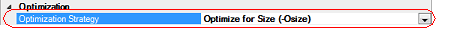 To perform optimization with the code size precedence, select [Optimize for Size (-Osize)] in the [Optimization Strategy] property in the [Optimization] category.