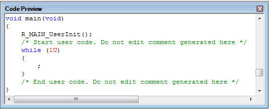 To confirm the source code, use the Code Preview panel that opens by double-clicking [Project name (Project)] >> [Code Generator (Design Tool)] >> [Code Preview] >> Peripheral function node >> Source code node (>> API function node) in the Project Tree panel.