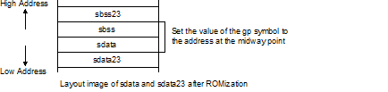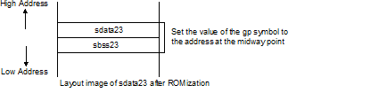 Sets the halfway point between the start address of the sdata23 or sbss23 section with the smallest address, and the end address of the sdata or sbss section with the greatest address (multiple of 2; if the midway point is an odd number, takes the first multiple of two) as the address value of the gp symbol.