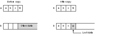 In the above example, the size of array a (including the null character) is 4 bytes. Copying by strcpy overwrites data beyond the boundary of array b.
