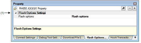 Specify with the Flash Options Setting dialog box. The Flash Options Setting dialog box is opened by clicking the [...] button that appears at right edge of this field when you select this property (you cannot specify options for the flash memory on this panel). Note that the contents of options for the flash memory that have been specified are not displayed on this panel. |