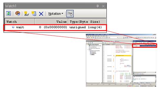 By registering a variable to the watch window, it is possible to display the value of that variable. In this section, you register a global variable called "wait" to the watch window and confirm that the value of the variable is incremented using a software break. The "wait" that is defined as a global variable which uses it as a timer use and counts up about 1 second (from H'0 to H'80000).