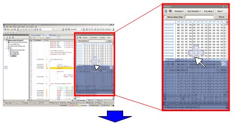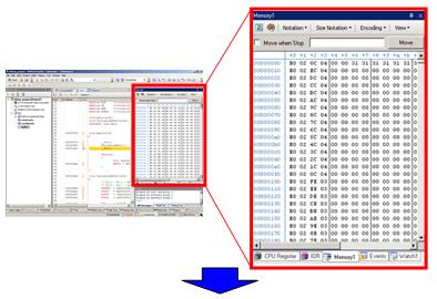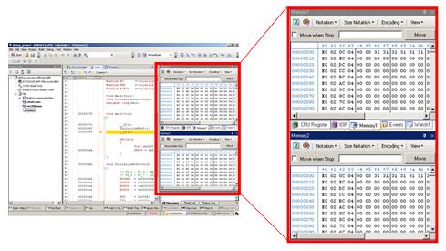The Memory panel displays the state of memory. In this example, we display two of the four Memory panels. If [Memory 1] and [Memory 2] are displayed at the same time, they are tabbed by default, making it impossible to view the both panels at same time. Let's dock these two panels so that they can be viewed together.