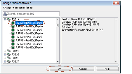 At this time, the current microcontroller is selected in the [Change microcontroller to] area.