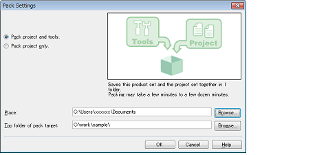 Specify the pack type (project and tools, or project only), save location folder, and the top folder of the packing target on the dialog box.