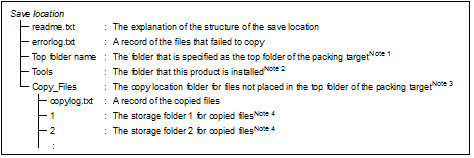 Files not placed inside the top folder of the packing target that is specified in the Pack Settings dialog box are copied to the Copy_Files folder when saving, so when using the save location project, you must re-register the files to the project. |