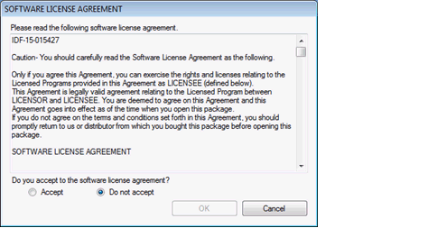 The SOFTWARE LICENSE AGREEMENT dialog box appears if you have not yet accepted the license agreement for addition of a node locked license.