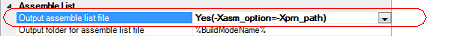 To output the assemble list file, select [Yes(-Xasm_option=-Xprn_path)] in the [Output assemble list file] property in the [Assemble List] category.