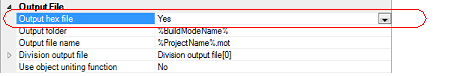 Select [Yes] in the [Output hex file] property in the [Output File] category.