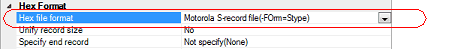 Select [Intel HEX file(-FOrm=Hexadecimal)] or [Motorola S-record file(-FOrm=Stype)] in the [Hex file format] property in the [Hex Format] category.