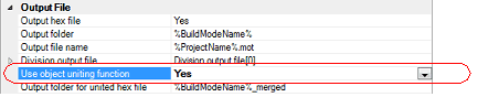 The destination where the combined hex file is to be output can be specified in [Output folder for united hex file] property (default: %BuildModeName%_merged).