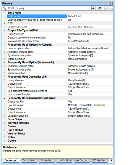 The assembly source file (except the file with the individual options) is assembled using the settings of the [Compile Options] tab.