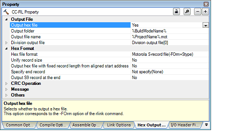 Be sure to specify this property. If the extension is omitted, it is automatically added according to the selection in the [Hex file format] property in the [Hex Format] category. When [Intel HEX file(-FOrm=Hexadecimal)] is selected: .hex When [Motorola S-record file(-FOrm=Stype)] is selected: .mot When [Binary file(-FOrm=Binary)] is selected: .bin The following placeholders are supported. %ActiveProjectName%: Replaces with the active project name. %BuildModeName%: Replaces with the build mode name. %MainProjectName%: Replaces with the main project name. %ProjectName%: Replaces with the project name. This property corresponds to the -OUtput option of the rlink command. This property is displayed only when [Yes] in the [Output hex file] property is selected. |