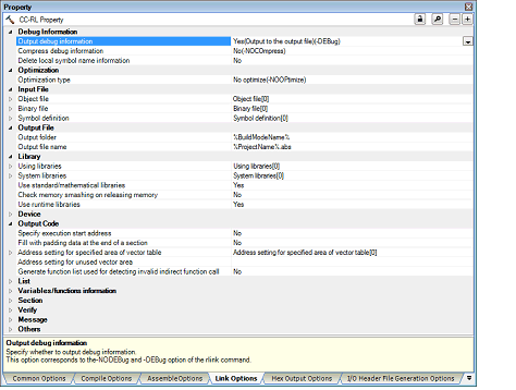 Select whether to output the variables/functions information header file. If [Yes(-VFINFO)] is selected, commands are called in the following order. Compiler and assembler commands will be called twice in a single build processing. 3. Optimizing linker (rlink) -VFINFO 4. Compiler (CC-RL) -preinclude=variables/functions information header file To edit the variables/functions information header file which has been output when using it, change this property to [No] and specify the edited file in the [Include files at head of compiling units] property of the [Compile Options] tab. The variables/functions information header file is registered in the File node of the project tree under the file name specified in the [Variables/functions information header file name] property. However, if a file with the same name has already been registered, this file is not registered. The variables/functions information header file of the project tree is not affected by the -preinclude option of the [Include files at head of compiling units] property at build, and the file specified by the [Variables/functions information header file name] property will be specified. This property corresponds to the -VFINFO option of the rlink command. This property is displayed when [Always latest version which was installed] or V1.01.00 or a later version is selected for the [Using compiler package version] property under the [Version Select] category on the [Common Options] tab in an environment where V1.01.00 or a later version of the CC-RL compiler has been installed. |