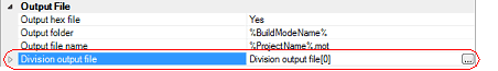 The setting of the hex file output range is made with the [Division output file] property in the [Output File] category.