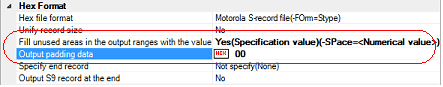 Select [Yes(Specification value)(-SPace=<Numerical value>)] in the [Fill unused areas in the output ranges with the value] property in the [Hex Format] category. The [Output padding data] property will be displayed.