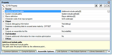 Specifies the name of the path to the folder that stores the include file. The following placeholders are supported. %ActiveProjectDir%: Replaces with the absolute path of the active project folder. %ActiveProjectName%: Replaces with the active project name. %BuildModeName%: Replaces with the build mode name. %MainProjectDir%: Replaces with the absolute path of the main project folder. %MainProjectName%: Replaces with the main project name. %MicomToolPath%: Replaces with the absolute path of the install folder of this product. %ProjectDir%: Replaces with the absolute path of the project folder. %ProjectName%: Replaces with the project name. %TempDir%: Replaces with the absolute path of the temporary folder. %WinDir%: Replaces with the absolute path of the Windows system folder. The reference point of the path is the project folder. This property corresponds to the -include option of the assembler. |
