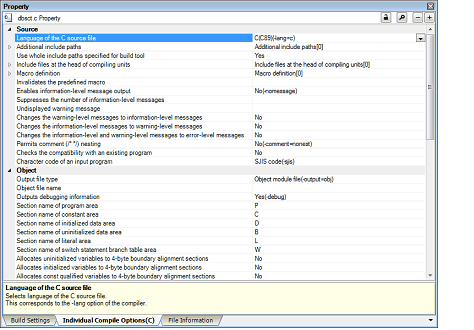 This tab is displayed only when [Yes] in the [Set individual compile option] property in the [Build] category from the [Build Settings] tab is selected. |