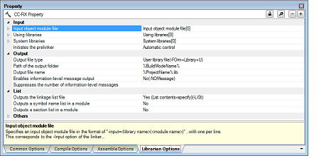 Specifies an input library file. The following placeholders are supported. %ActiveProjectDir%: Replaces with the absolute path of the active project folder. %ActiveProjectName%: Replaces with the active project name. %BuildModeName%: Replaces with the build mode name. %MainProjectDir%: Replaces with the absolute path of the main project folder. %MainProjectName%: Replaces with the main project name. %MicomToolPath%: Replaces with the absolute path of the install folder of this product. %ProjectDir%: Replaces with the absolute path of the project folder. %ProjectName%: Replaces with the project name. %TempDir%: Replaces with the absolute path of the temporary folder. %WinDir%: Replaces with the absolute path of the Windows system folder. This property corresponds to the -library option of the linker. |