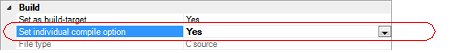 Select a C source file on the project tree and select the [Build Settings] tab on the Property panel. In the [Build] category, if you select [Yes] on the [Set individual compile option] property, the Message Dialog Box is displayed.