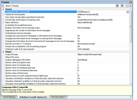 You can set compile options for the C source file by setting the necessary properties in this tab. Note that this tab takes over the settings of the [Compile Options] tab by default.