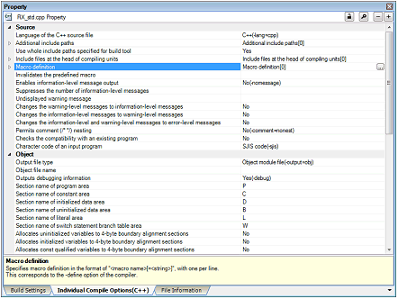 You can set compile options for the C++ source file by setting the necessary properties in this tab. Note that this tab takes over the settings of the [Compile Options] tab by default.
