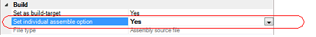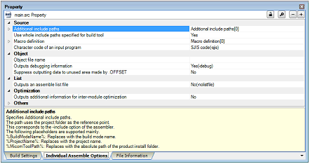 You can set assemble options for the assembler source file by setting the necessary properties in this tab. Note that this tab takes over the settings of the [Assemble Options] tab by default.