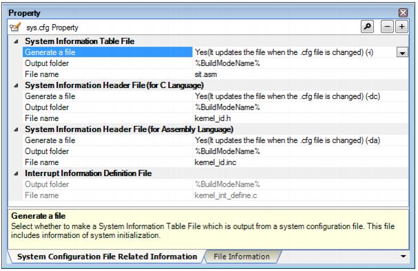 On the [System Configuration File Related Information] tab, set the output of information files (system information table file and system information header files).