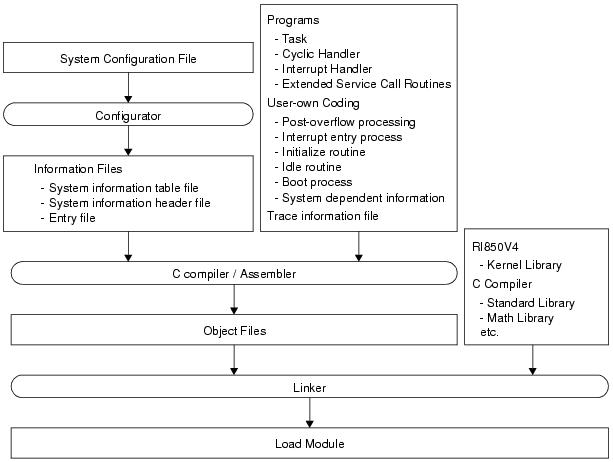 System building consists in the creation of a load module using the files (kernel library, etc.) installed on the user development environment (host machine) from the RI850V4's supply media.