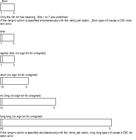 The types that can be specified for bit fields are _Bool, char, signed char, unsigned char, signed short, unsigned short, signed int, unsigned int, signed long, unsigned long, signed long long, unsigned long long, and enumerated types. However, only signed int and unsigned int types can be specified when the -lang=c option and -strict_std option are specified.