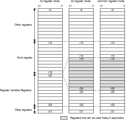 The CC-RH provides three register modes. By specifying these register modes efficiently, the contents of some registers do not need to be saved or restored when an interrupt occurs or the task is switched. As a result, the processing speed can be improved. The register modes are specified by using the register mode specification option (-Xreg_mode) of the CC-RH. This function reduces the number of registers internally used by the CC-RH on a step-by-step basis. As a result, the following effects can be expected: