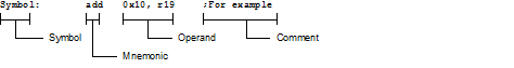 [symbol][:]       [mnemonic]     [operand], [operand]    ;[comment]