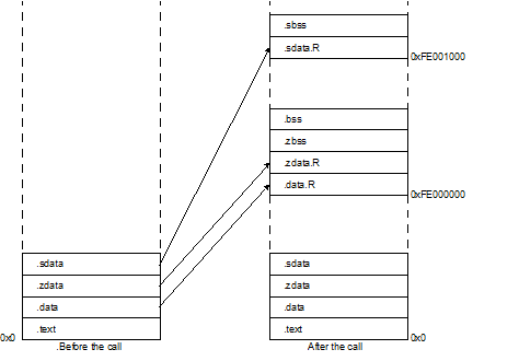 When the user program is executed, .data.R, .zdata.R, .zbss, and .bss at address 0xFE000000 and .sdata.R and .bss at address 0xFE001000 are initialized before they are used.
