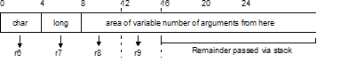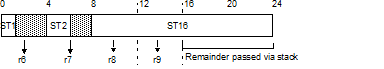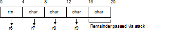 The first 4 words (16 bytes) of the created memory image are passed via registers r6 to r9, and the portion that does not fit is passed on the stack |
