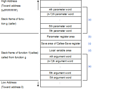 If the size of the parameters is greater than 4 words (16 bytes), then the required area for the size of the parameter register area is allocated. The size of this area will be either 0, 4, 8, 12, or 16 bytes, because it stores parameter registers r6 to r9, as necessary.