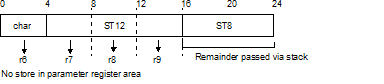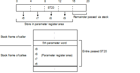 For example, when passing the value of a 20-byte structure argument, 16 bytes are passed in r6 to r9, and the remaining 4 bytes (the 5th parameter word) are passed on the stack.