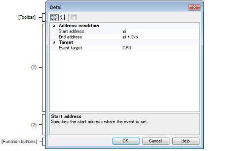 This dialog box is used to display and change the detailed information on the point trace event selected on the Events panel. For details on point trace event setting, see "2.13 Collect Execution History of Programs".