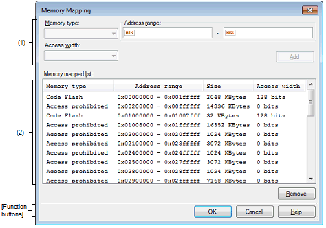 Adds the content specified in this area to memory mapping. The added memory mapping is displayed in the [Memory mapped list] area. The changes will not take effect until the [OK] button is clicked. |